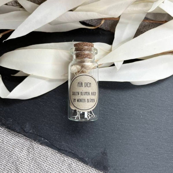 - Mini Glasfläschchen (10ml, 5,5 cm (H) und 2 cm Durchmesser) mit Graspapier-Etikett und Trockenblumen: „Für Dich sollen Blumen auch im Winter blühen“