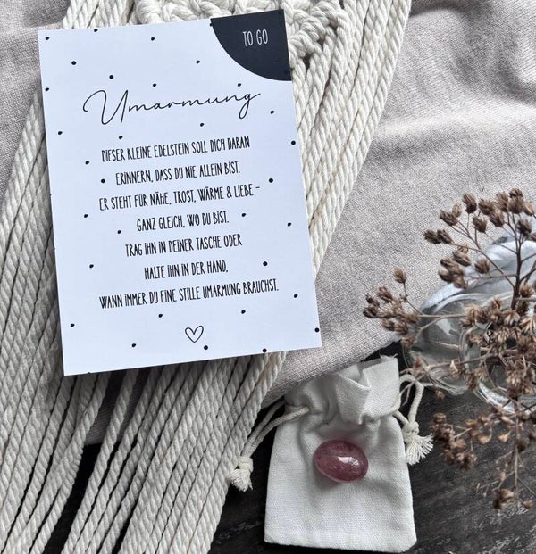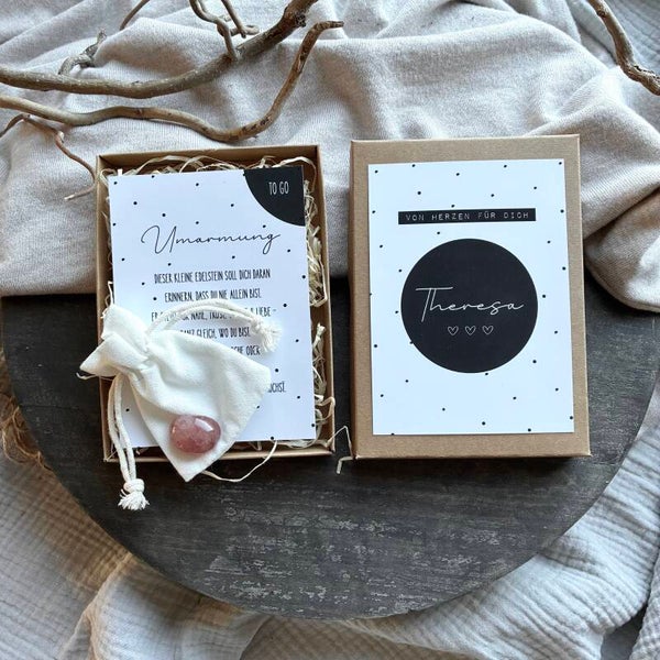 Mit viel Liebe gestaltet, verbindet diese Geschenkbox Individualität mit einer besonderen Botschaft, die direkt von Herzen kommt. Jede Komponente ist sorgfältig ausgewählt und arrangiert, sodass der Empfänger nicht nur eine kleine Aufmerksamkeit, sondern auch ein Stück Wärme und Geborgenheit erhält. Die liebevolle Kombination aus einzigartigem Design, natürlichen Materialien und dem Erdbeerquarz als Symbol für Glück und positive Energie macht dieses Set zu etwas ganz Besonderem. So entsteht ein liebevolles Präsent, das lange in Erinnerung bleibt und jedem Anlass eine persönliche Note verleiht.