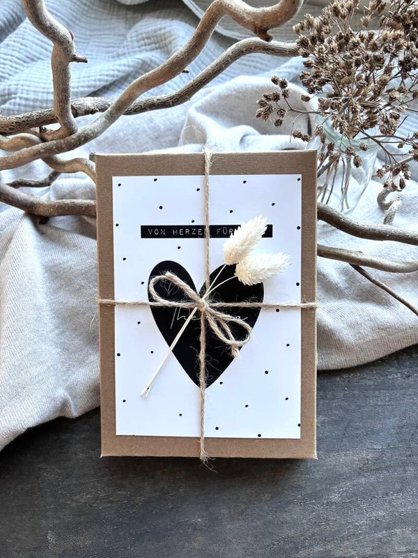 Du kannst das Motiv deiner Geschenkbox auswählen. Zur Auswahl stehen: Kreis Schwarz und Herz Beige (siehe Produktfotos).