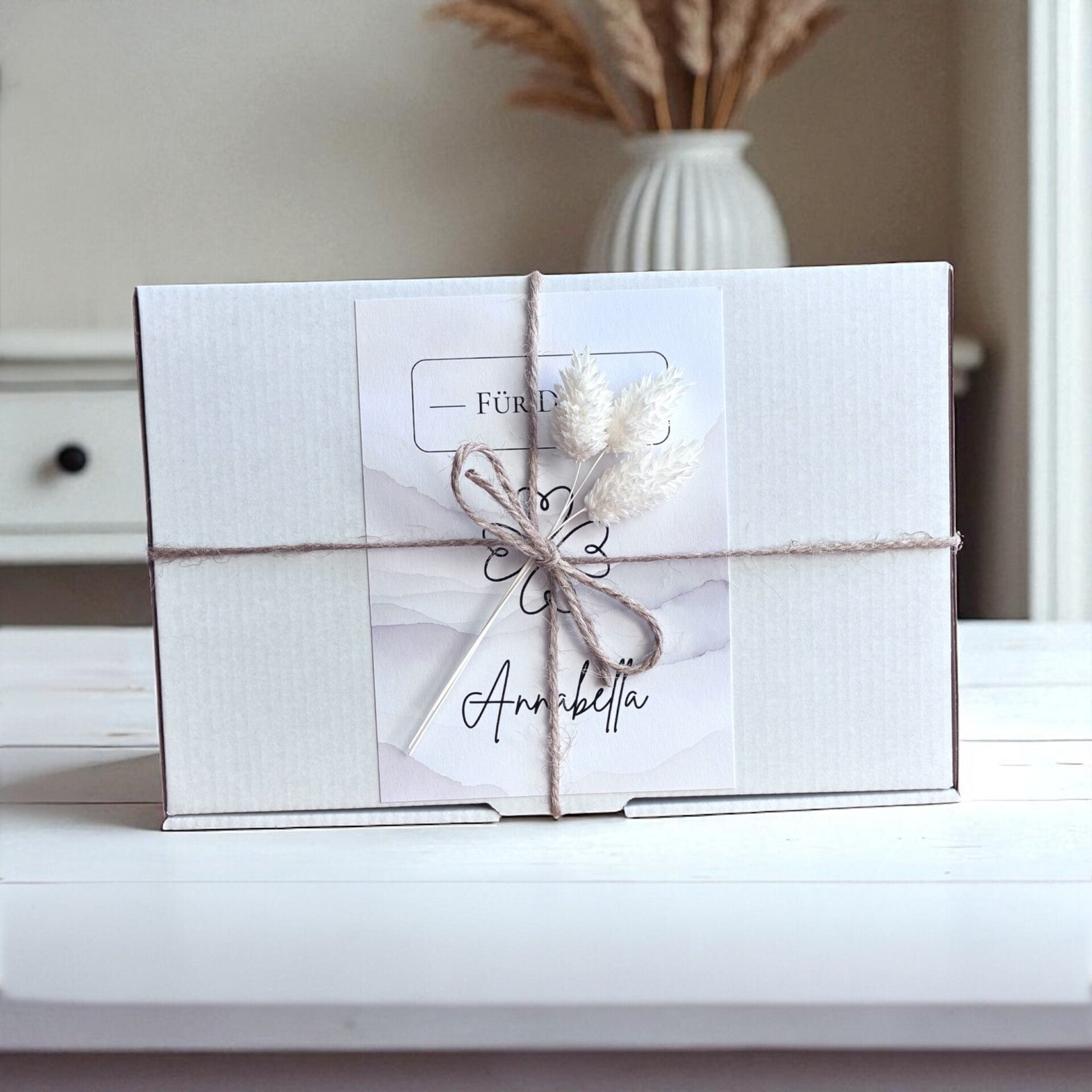 Jutegarn, personalisierte Geburtstagskarte und Trockenblumen